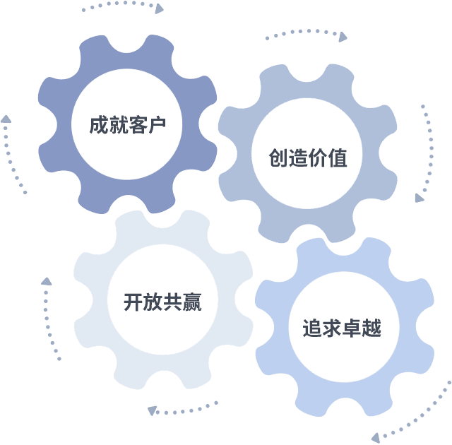 成就客户是一切决策的出发点,,,,创造价值是衡量所有工作的标准,,,追求卓越是我们做事做人的态度,,,开放共赢是我们的格局也是最终的结果。。价值观的齿轮环环相扣,,,,推动着组织里的每个人不断向前。。。。